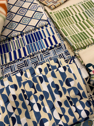 Whilst viewing Sarah Campbell's collection at the Tissus d'Helene showroom, I had a delve into the other artisanal fabrics and papers on display. Forever drawn to more vintage style florals and stripes, which thank fully were in abundance at this showroom. I love seeing the co-ordinating prints and colour palettes with these style of prints too. Lots of white or cream grounds with muted tones in the print seemed popular here, another nice way of subtly adding pattern into the home.